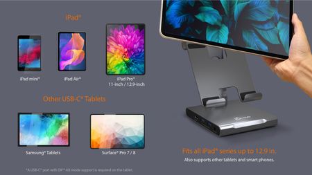 Стійка перетворює ваш планшет iPad® або Android™ на ідеальну портативну робочу станцію, забезпечуючи всі ваші потреби в розширенні в офісі, вдома або в дорозі.