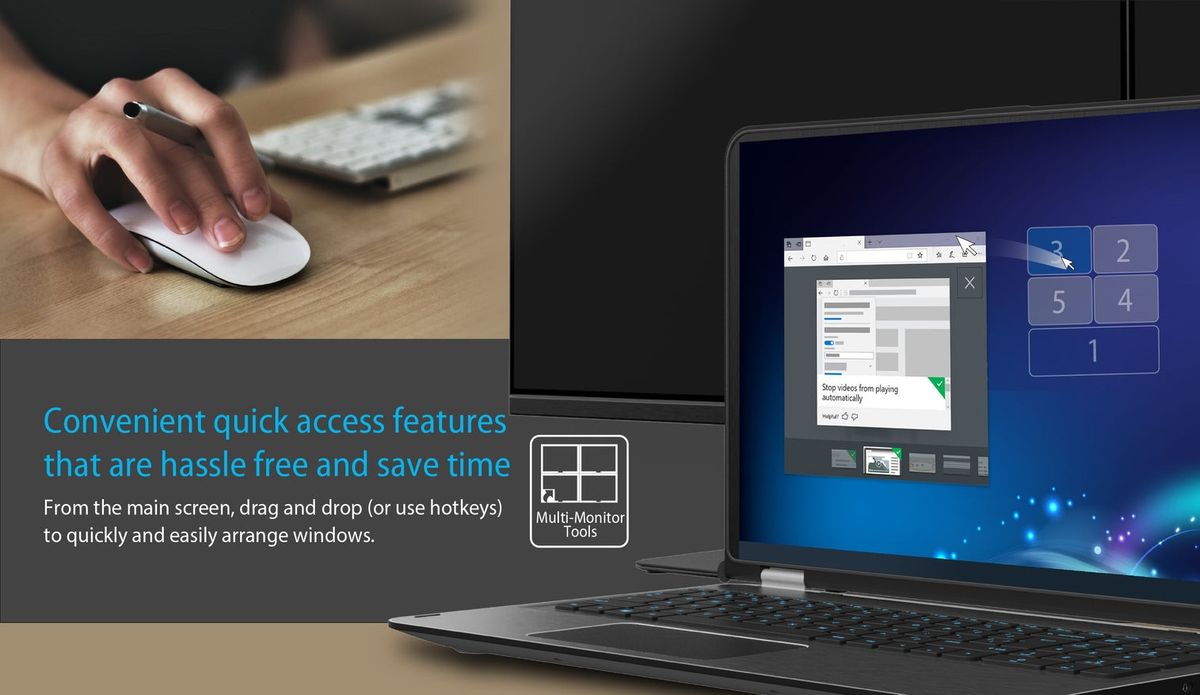 - БЕЗКОШТОВНА ПРОГРАМА — ШВИДКЕ ПРИЗНАЧЕННЯ КІЛЬКОХ ВІКОН: Програма Multi-Monitor Assistant допомагає перетягувати, збільшувати та зменшувати, циклічно відображати курсор, каскадувати вікна на основному дисплеї та циклічно розширювати вікна на декількох моніторах за допомогою простих рухів (наразі доступно тільки для Windows®).