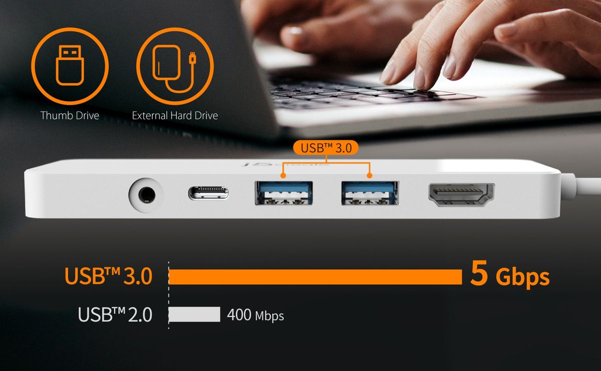 Наш багатопортовий концентратор USB-C® з функцією Power Delivery забезпечує додаткові можливості підключення для вашого комп’ютера. Цей кишеньковий мультиадаптер з 2 портами USB™ 3.1 Type-A дозволяє підключити зовнішню клавіатуру, мишу або флеш-накопичувач USB™. Завдяки високій швидкості передачі даних до 5 Гбіт/с, передача даних відбувається швидко і легко. Порт HDMI™ дозволяє дзеркально відображати або розширювати екран і безпосередньо виводити відео 4K UHD @ 30 Гц або Full HD 1080p на HDTV, монітор або проектор.