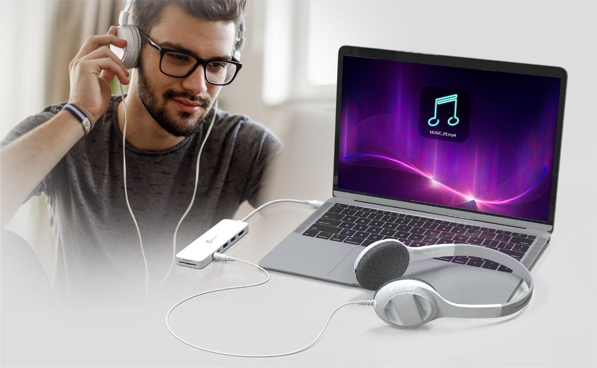 Оснащений портом зарядки USB-C® Power Delivery 3.0. Забезпечує зарядку потужністю до 60 Вт при підключенні до адаптера живлення USB-C®. Хаб також забезпечує прямий доступ до карт пам’яті SD™ і microSD™. Комбінований аудіо роз’єм дозволяє підключити навушники або колонки.