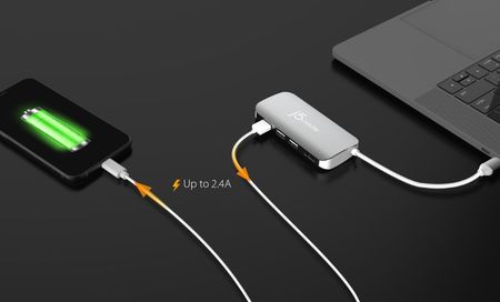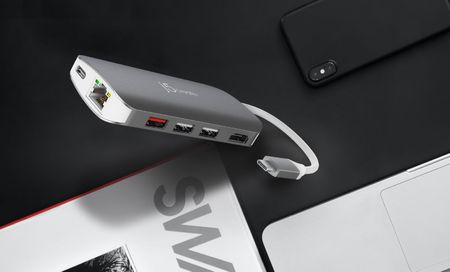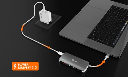 Завдяки USB-C® Power Delivery 3.0 адаптер забезпечує заряджання в обох напрямках при підключенні до адаптера живлення USB-C®. Він також забезпечує прямий доступ до дротової мережі та карт пам’яті SD™ і microSD™.