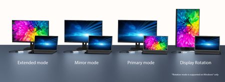 Режим дзеркального відображення використовується для клонування одного екрана на інший, що ідеально підходить для презентацій. Розширений режим дозволяє розширити робочий стіл на кілька дисплеїв, що чудово підходить для роботи з електронними таблицями. Основний режим дозволяє відкривати окремі програми на кожному моніторі, що значно підвищує продуктивність. Поворот дисплея дозволяє переглядати зображення або звіт у вертикальному положенні, що ідеально підходить для рентгенівських знімків.