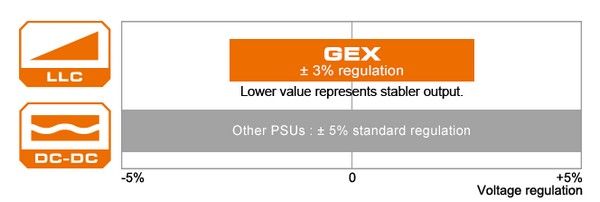 Конструкція GEX LLC, DC-DC і Tri-Sense (3,3 В, 5 В і 12 В) була розроблена для забезпечення стабільної роботи з надзвичайно жорстким 3% регулюванням напруги.