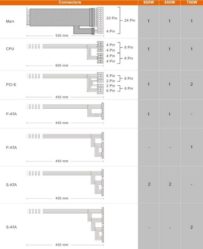 - Потужність по лінії +3.3 В; +5 В: 130 Вт
